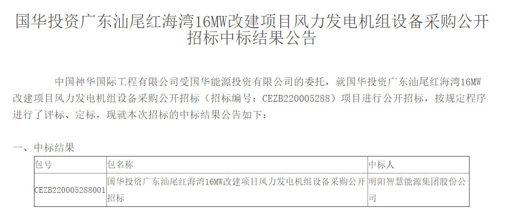日前,國(guó)華投資廣東汕尾紅海灣16MW改建項(xiàng)目風(fēng)力發(fā)電機(jī)組設(shè)備采購(gòu)公開招標(biāo)結(jié)果,明陽(yáng)智能成功中標(biāo);國(guó)華投資國(guó)華(汕尾)風(fēng)電有限公司紅海灣風(fēng)電場(chǎng)項(xiàng)目EPC總承包工程公開招標(biāo)結(jié)果,明陽(yáng)智能旗下潤(rùn)陽(yáng)能源技術(shù)有限公司(簡(jiǎn)稱:潤(rùn)陽(yáng)能源)全資子公司天津明智潤(rùn)陽(yáng)技術(shù)有限公司成功中標(biāo)。