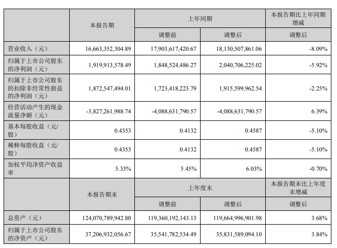報告期內(nèi),公司實現(xiàn)營業(yè)收入人民幣1,666,335.23萬元,同比下降8.09%;實現(xiàn)歸屬母公司凈利潤人民幣191,991.36萬元,同比下降5.92%。