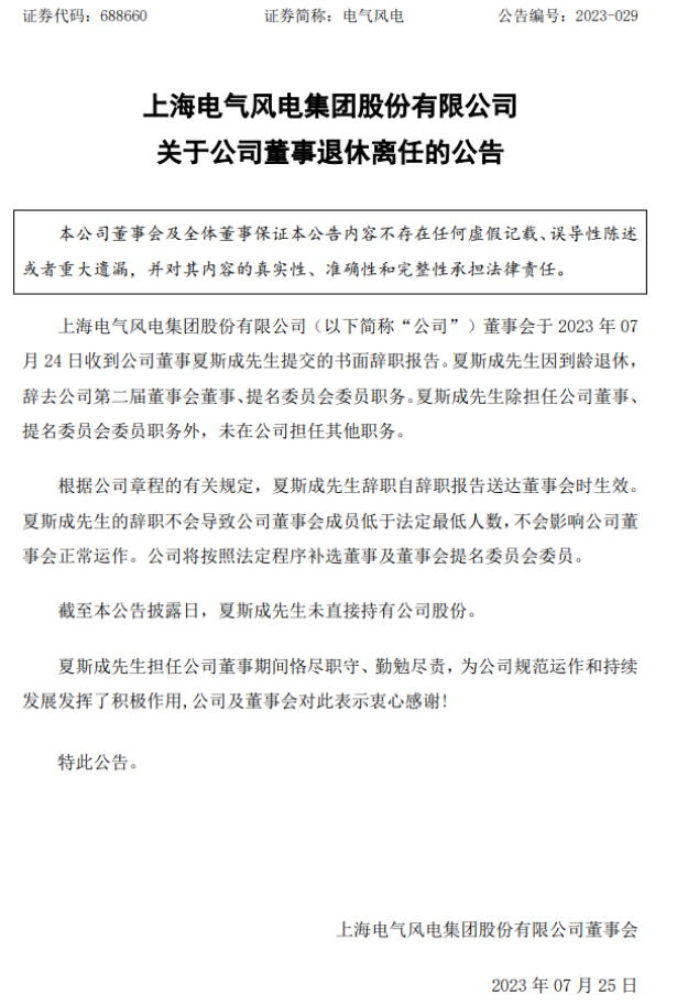 公告稱(chēng),電氣風(fēng)電董事會(huì)于2023年7月24日收到公司董事夏斯成先生提交的書(shū)面辭職報(bào)告。夏斯成先生因到齡退休,辭去公司第二屆董事會(huì)董事、提名委員會(huì)委員職務(wù)。夏斯成先生除擔(dān)任公司董事、提名委員會(huì)委員職務(wù)外,未在公司擔(dān)任其他職務(wù)。
