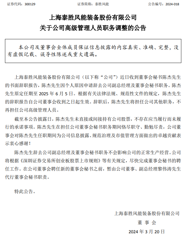3月20日,上海泰勝風能裝備股份有限公司(簡稱:泰勝風能)發(fā)布關于公司高級管理人員職務調整的公告。