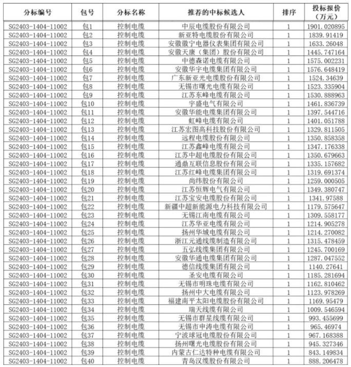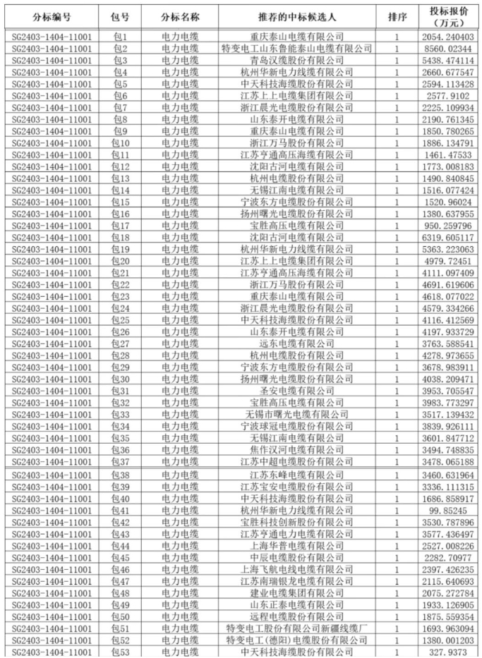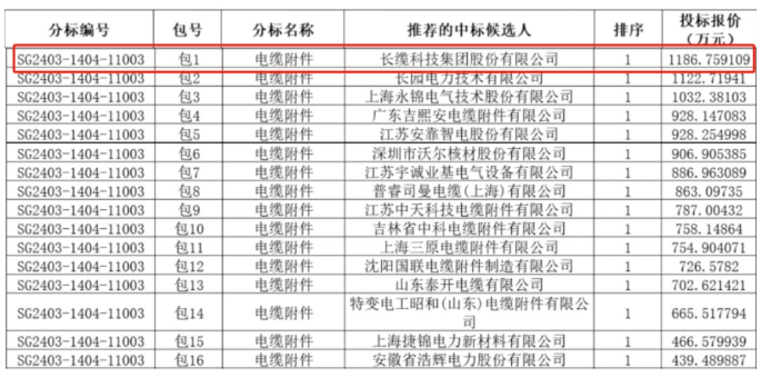 電纜附件一共16包,長纜科技中標包1,報價為1186.759109萬元,中標金額居16家中標廠商中第一位置。