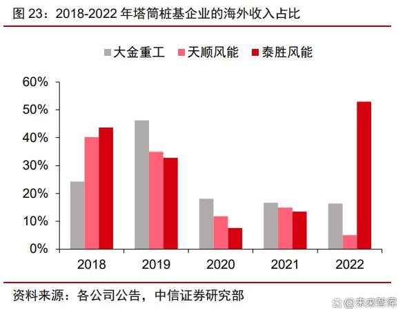 國內(nèi)企業(yè)塔筒出海勢頭加速,單樁出口實現(xiàn)突破。大金重工、天順風(fēng)能、泰勝風(fēng)能的 出口比例接近,國內(nèi)企業(yè)以出口塔筒產(chǎn)品為主,海外客戶的供應(yīng)商體制使有出口業(yè)績的公 司具備更好的客戶端優(yōu)勢;樁基因運(yùn)輸效率低和方案不成熟的問題,需求仍主要由海外本 地產(chǎn)能滿足。根據(jù)大金重工公告,公司憑其基礎(chǔ)設(shè)施、港口條件和工藝裝備和對海外業(yè)務(wù) 的加大投入,于 2022 年攬入 6 項海風(fēng)海外項目,包括 5 項歐洲項目,成為國內(nèi)首家管樁 產(chǎn)品出口歐洲的企業(yè),打開國產(chǎn)樁基的歐洲市場。