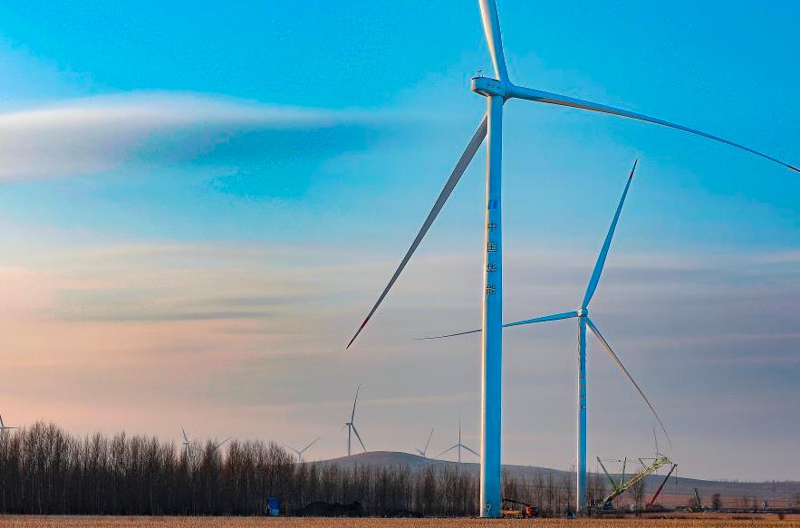 2022年12月27日,施工人員在華能突泉30萬千瓦風(fēng)電項目建設(shè)現(xiàn)場吊裝最后一臺風(fēng)電組件。