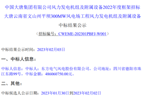 公告顯示,東方電氣風電股份有限公司成功中標該項目,中標價格為486060750.00元。