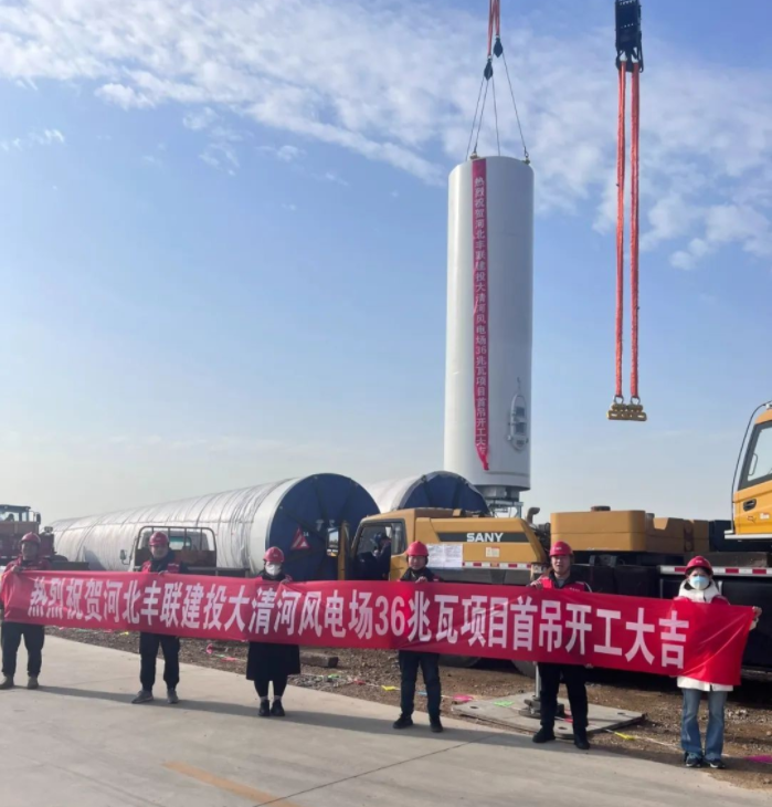 2023年3月14日,隨著第一節(jié)塔筒緩緩升起,標志著“河北豐聯(lián)建投大清河風電場36 MW風電場項目首吊”順利開工。