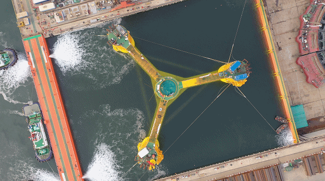 “海油觀瀾號”平臺由3個(gè)邊立柱和1個(gè)中心柱組成,邊長超80米,高約35米,重近4000噸,風(fēng)機(jī)安裝在中心立柱上。漂浮式風(fēng)電不同于傳統(tǒng)的固定式海上風(fēng)力發(fā)電機(jī),它將基礎(chǔ)由固定式改為漂浮式,使風(fēng)機(jī)“漂”在水面上。