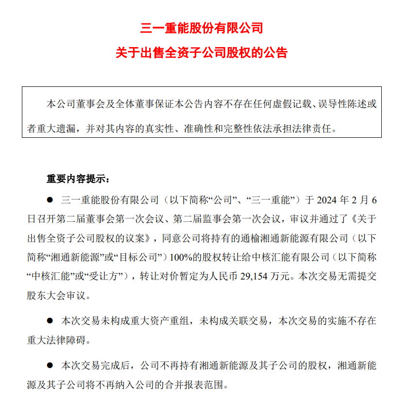 公告披露,公司將持有的通榆湘通新能源有限公司(簡稱“湘通新能源”)100%的股權(quán)轉(zhuǎn)讓給中核匯能有限公司,轉(zhuǎn)讓對價(jià)暫定為2.92億元。