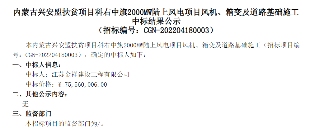 內(nèi)蒙古興安盟扶貧項(xiàng)目科右中旗2000MW陸上風(fēng)電項(xiàng)目風(fēng)機(jī)、箱變及道路基礎(chǔ)施工中標(biāo)結(jié)果公示: