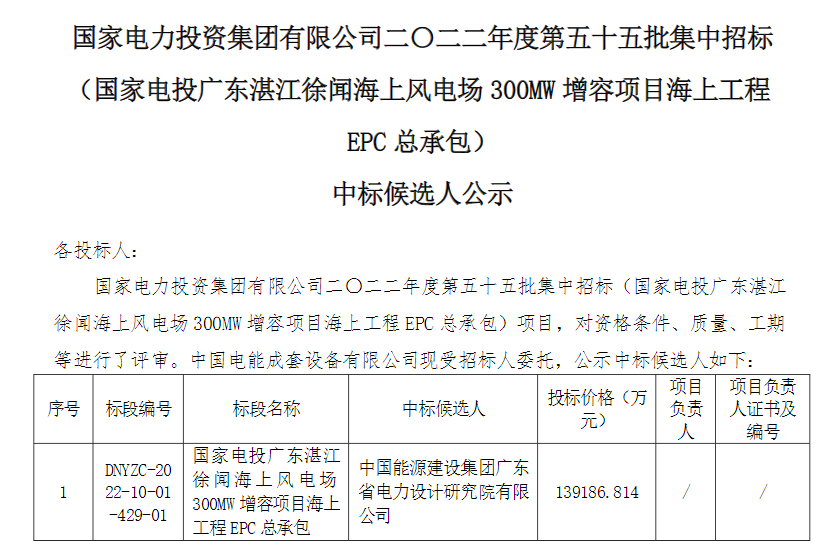1月15日,國家電投廣東湛江徐聞海上風(fēng)電場300MW增容項目海上工程EPC總承包中標(biāo)候選人公示,中國能源建設(shè)集團廣東省電力設(shè)計研究院有限公司預(yù)中標(biāo),投標(biāo)報價13.92億元。