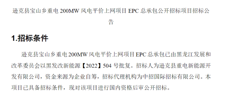 公告顯示,遜克縣寶山鄉(xiāng)重電200MW風電平價上網項目位于黑龍江省黑河市遜克縣寶山鄉(xiāng)境內,場址中心距遜克縣城直線距離約50km,規(guī)劃裝機總容量為200MW,一次性建設完成,風電場擬安裝32臺H193-6.25MW機型。