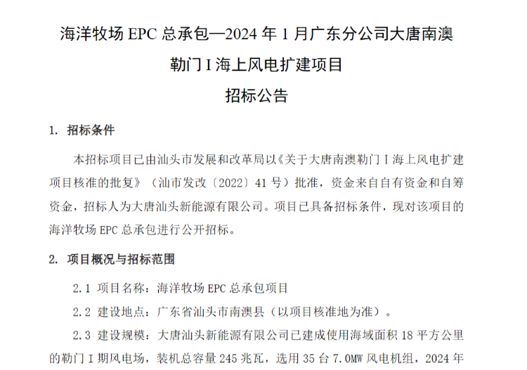 招標(biāo)范圍:本次招標(biāo)為大唐南澳勒門 I 海上風(fēng)電擴(kuò)建項目海洋牧場 EPC總承包工程,包括但不限于勘察設(shè)計、采購、運(yùn)輸、施工、調(diào)試、驗收、質(zhì)量保證服務(wù)(含 CCS 檢測認(rèn)證、三同時)等全部工作及招標(biāo)技術(shù)文件規(guī)定的其它工作,具體工作范圍詳見技術(shù)規(guī)范書。
