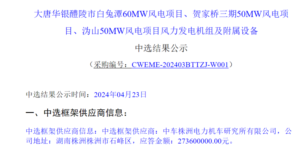 中車株洲電力機(jī)車研究所有限公司成功中標(biāo)大唐華銀醴陵市白兔潭60MW風(fēng)電項(xiàng)目、賀家橋三期50MW風(fēng)電項(xiàng)目、溈山50MW風(fēng)電項(xiàng)目,中標(biāo)價(jià)格為273600000.00元。