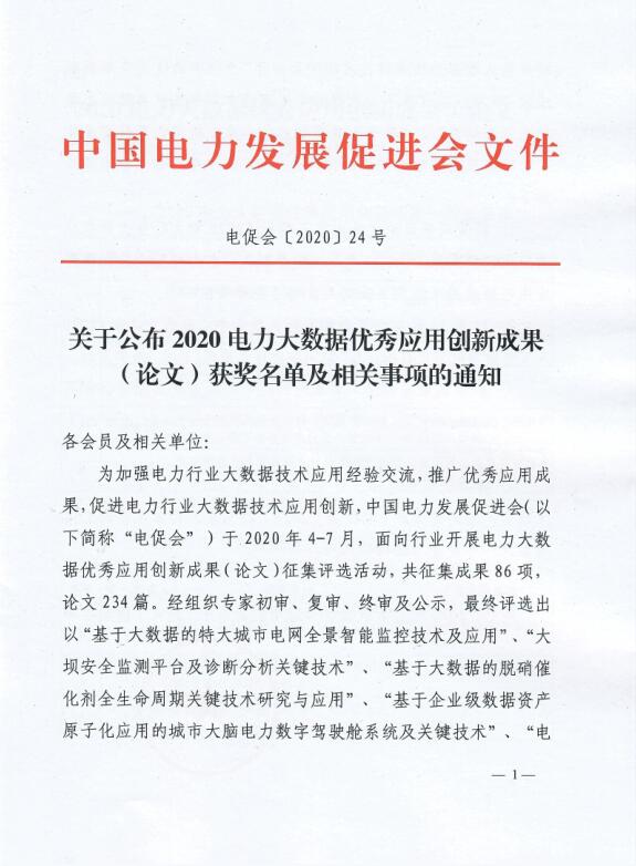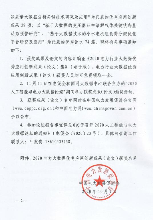 2.11月11日在電促會(huì)和國(guó)網(wǎng)大數(shù)據(jù)中心聯(lián)合主辦的“2020人工智能與電力大數(shù)據(jù)論壇”期間舉辦獲獎(jiǎng)成果(論文)頒獎(jiǎng)活動(dòng)。