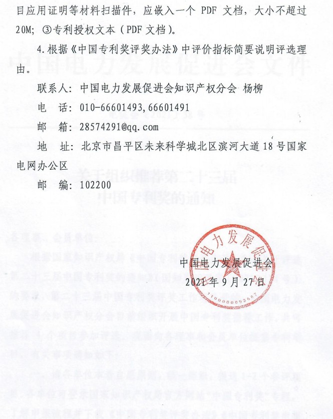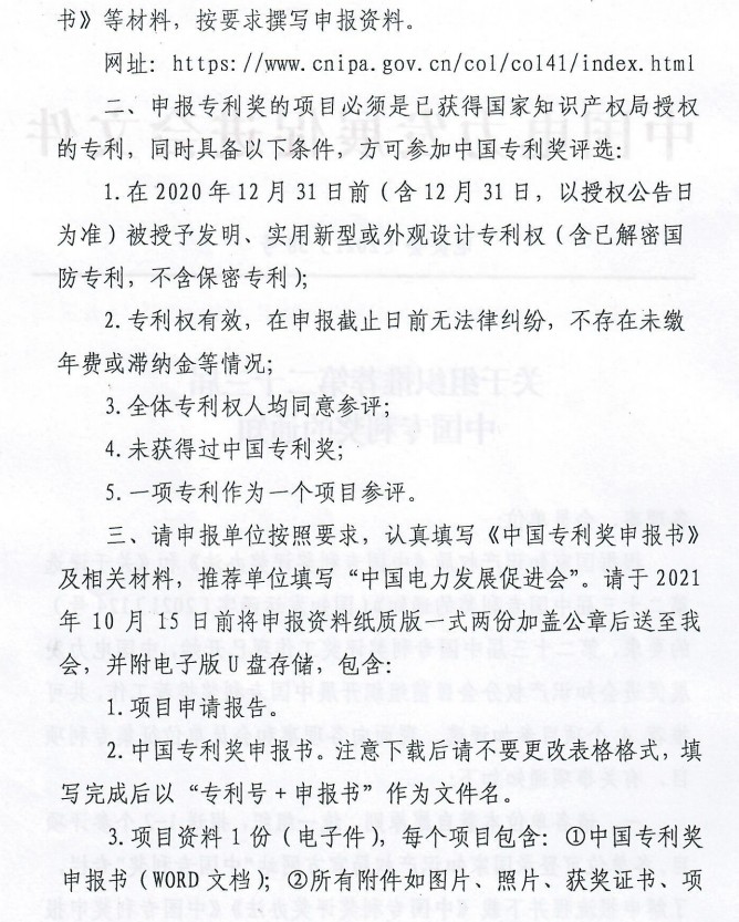 三、請申報(bào)單位按照要求,認(rèn)真填寫《中國專利獎(jiǎng)申報(bào)書》及相關(guān)材料,推薦單位填寫“中國電力發(fā)展促進(jìn)會(huì)”。請于2021年10月15日前將申報(bào)資料紙質(zhì)版一式兩份加蓋公章后送至我會(huì),并附電子版U盤存儲(chǔ),包含: