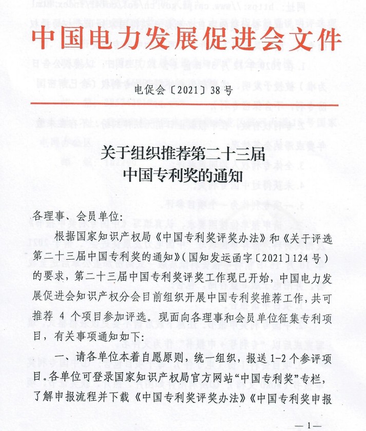 根據(jù)國家知識(shí)產(chǎn)權(quán)局《中國專利獎(jiǎng)評獎(jiǎng)辦法》和《關(guān)于評選第二十三屆中國專利獎(jiǎng)的通知》(國知發(fā)運(yùn)函字〔2021〕124號(hào))的要求,第二十三屆中國專利獎(jiǎng)評獎(jiǎng)工作現(xiàn)已開始,中國電力發(fā)展促進(jìn)會(huì)知識(shí)產(chǎn)權(quán)分會(huì)目前組織開展中國專利獎(jiǎng)推薦工作,共可推薦4個(gè)項(xiàng)目參加評選。現(xiàn)面向各理事和會(huì)員單位征集專利項(xiàng)目,有關(guān)事項(xiàng)通知如下: