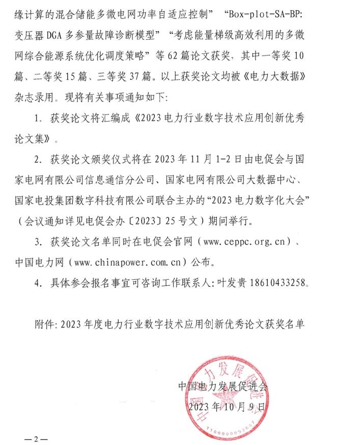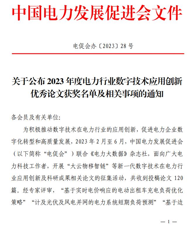 關于公布2023年度電力行業(yè)數(shù)字技術應用創(chuàng)新優(yōu)秀論文獲獎名單及相關事項的通知