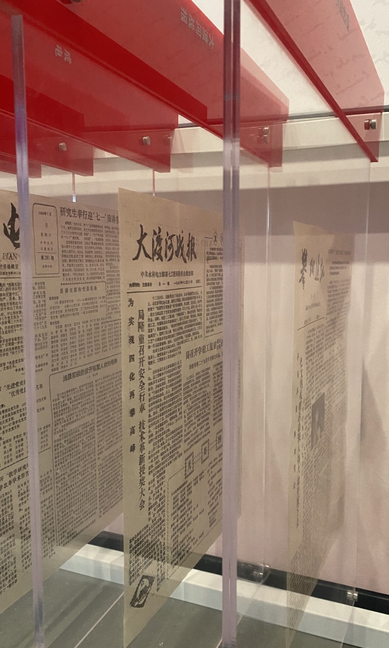 現(xiàn)場展出的大渡河水電報創(chuàng)刊號為《大渡河戰(zhàn)報》,出刊于1978年12月,誕生于十一屆三中全會召開時期,4開4版,與解放思想,改革開放同行。發(fā)刊詞上,明確辦報方針:實事求是,群眾路線,力求做到尖銳、潑辣、鮮明。一路走來,初心不改,為歷史發(fā)聲,為時代立傳,報道水電七局重大歷史事件、重大工程節(jié)點、職工工作生活感悟等。