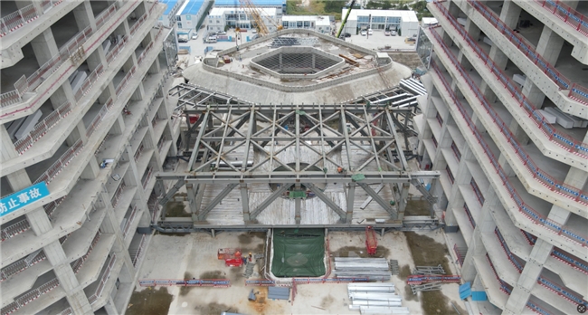 突破常規(guī),技術(shù)創(chuàng)新引領(lǐng)千噸連廊平地起。為降低施工風(fēng)險、提高施工效率,項目根據(jù)國內(nèi)外類似工程建造經(jīng)驗,查閱大量國內(nèi)外相關(guān)專業(yè)資料,逐一攻克了鋼結(jié)構(gòu)轉(zhuǎn)換胎架拼裝平臺免回頂技術(shù)、鋼結(jié)構(gòu)桁架預(yù)起拱技術(shù)、鋼連廊結(jié)構(gòu)自提升技術(shù)、鋼連廊液壓整體提升技術(shù),為鋼結(jié)構(gòu)連廊施工全過程提供技術(shù)保障。