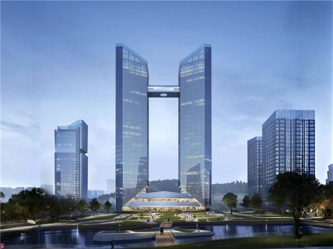 國惠科創(chuàng)中心項目位于濟南市高新區(qū)漢峪金谷片區(qū),總建筑面積33.51萬平方米,其中一標段建筑面積16.7萬平方米。包含兩棟45層商務(wù)辦公樓,建筑高度220米。底部為3層商業(yè)裙房,地下室共5層,包含1層設(shè)備夾層。主要功能為商務(wù)辦公、商業(yè)等。雙子塔樓38至40層設(shè)計有一個鋼結(jié)構(gòu)連廊將兩棟塔樓連通,采用鋼桁架結(jié)構(gòu)體系,總重約960噸,鋼連廊距地高度172.5米,跨度45.5米,寬度20.8米,高度9.15米,跨越兩層結(jié)構(gòu)。