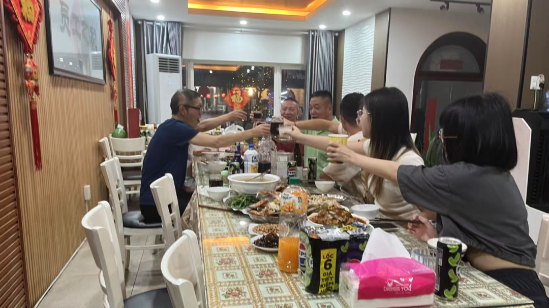 越南辦事處年夜飯在熱鬧的氛圍中拉開序幕。員工餐廳里喜慶的紅色福字格外搶眼,空氣中彌漫著各種美食的香氣。領導同事們歡聚一堂,臉上洋溢著幸福的笑容。桌上豐盛的家鄉(xiāng)菜,無時無刻不讓人感受到暖暖的心意。大家一邊品嘗美食,一邊為彼此送上最真誠的新年祝福,綿綿不斷的歡聲笑語回蕩在餐廳中。即便大家都身處異國他鄉(xiāng),不能與親人團聚,但此刻大家仿佛就是一個溫暖的大家庭,共同迎接著新年的到來。