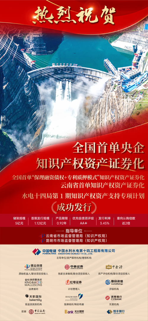 2023年12月29日,在歷經(jīng)一年多的政策解讀、行業(yè)調(diào)研、市場挖掘、方案設(shè)計、可行性論證、項目推動、申報、發(fā)行等一系列工作后,公司所屬水電十四局主導(dǎo)的“水電十四局第1期知識產(chǎn)權(quán)資產(chǎn)支持專項計劃”在深圳證券交易所成功發(fā)行并設(shè)立。標(biāo)志著全國央企首單、全國“保理融資債權(quán)+專利質(zhì)押模式”首單知識產(chǎn)權(quán)資產(chǎn)證券化成功落地。中國電建成為第一家成功發(fā)行知識產(chǎn)權(quán)證券的央企單位。