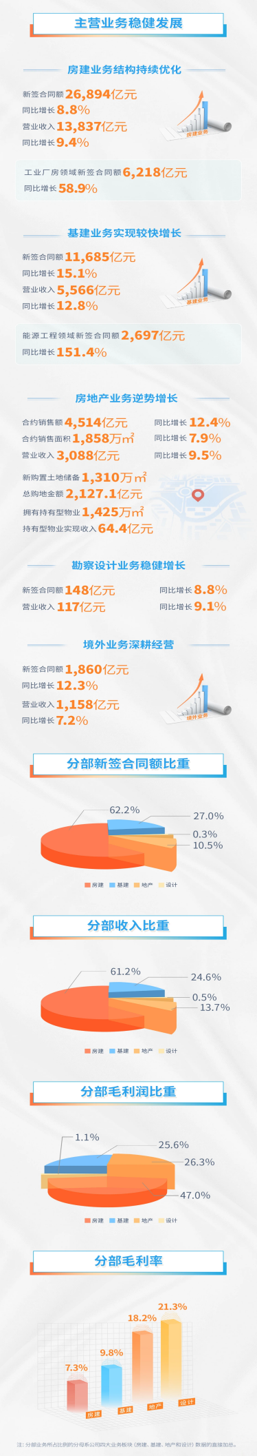 房建業(yè)務結構持續(xù)優(yōu)化,新簽合同額2.69萬億元、同比增長8.8%;工業(yè)廠房、科教文衛(wèi)體設施、商業(yè)綜合等公共建筑領域新簽合同額占比持續(xù)提升;基建業(yè)務發(fā)力重點領域,新簽合同額11,685億元,同比增長15.1%;市政工程、交通運輸工程等領域取得一批重大工程;能源工程、水務及環(huán)保、水利水運等領域取得新突破,新簽合同額合計占比提升至37.3%;地產業(yè)務加快適應新發(fā)展模式,中海地產權益銷售額位列行業(yè)第二,利潤率保持行業(yè)領先,主要指標穩(wěn)中有升。堅持聚焦高能級城市的投資布局,全年新購置土地43宗,新增土地儲備764萬平方米,新增土地貨值位列行業(yè)第一,購地金額人民幣1,342.1億元。全年實現(xiàn)合約銷售額2,670億元,同比增長4.9%。堅持穩(wěn)健審慎的財務策略,牢牢把握“三道紅線”調控下處于綠檔的優(yōu)勢,堅持精益建造,在聚焦加快發(fā)展住宅開發(fā)主業(yè)的同時,推動商業(yè)物業(yè)、教育養(yǎng)老、物流等業(yè)務發(fā)展。中建地產積極應對市場變化,豐富土地獲取路徑和方式,新購置土地59宗,新增土地儲備546萬平方米,購地金額785億元;全年實現(xiàn)合約銷售額1,844億元,同比增長25.3%??辈煸O計業(yè)務穩(wěn)健增長,夯實傳統(tǒng)設計主業(yè),新簽合同額148億元,營業(yè)收入117億元。境外業(yè)務堅持深耕運營,全力應對復雜多變的國際形勢,持續(xù)增強全球資源配置能力。新簽合同額1,860億元,同比增加12.3%,其中建筑業(yè)務新簽合同額1,755億元,同比增長15.4%。公司大力實施海外高質量發(fā)展戰(zhàn)略,積極參與共建“一帶一路”國際合作。