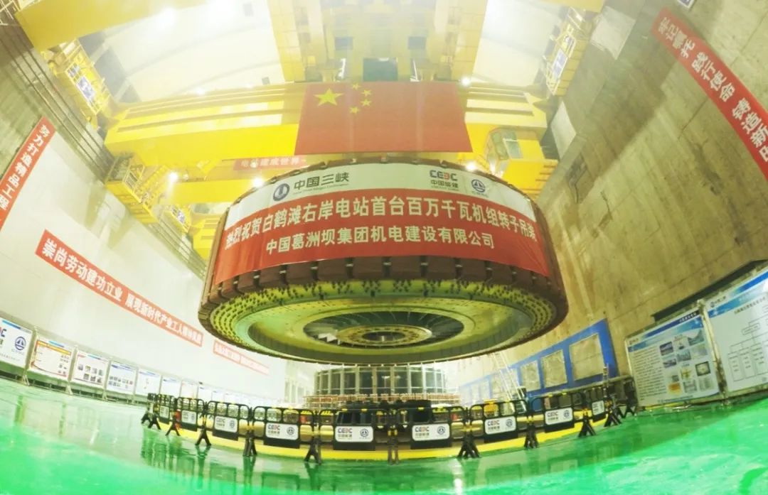 白鶴灘右岸電站首臺百萬千瓦機(jī)組轉(zhuǎn)子吊裝