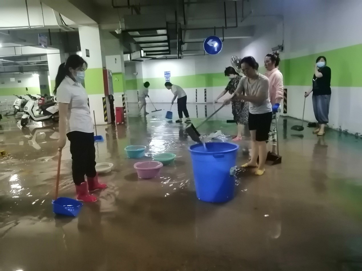 居住地為升龍?zhí)靺R廣場(chǎng)1號(hào)院小區(qū)的劉丹,是安質(zhì)部的員工,小區(qū)處于鄭州市中原區(qū),負(fù)二樓全部被淹沒(méi),負(fù)一樓積水近半米。謝丹利用在下班時(shí)間,協(xié)助物業(yè)工作人員進(jìn)行車庫(kù)清淤工作。積水中混雜大量淤泥,無(wú)法使用機(jī)械清淤,大家都是使用掃帚、簸箕等簡(jiǎn)單工具手工清理。7月26日晚間,小區(qū)負(fù)一樓地下車庫(kù)基本清理完畢,可以正常投入使用。