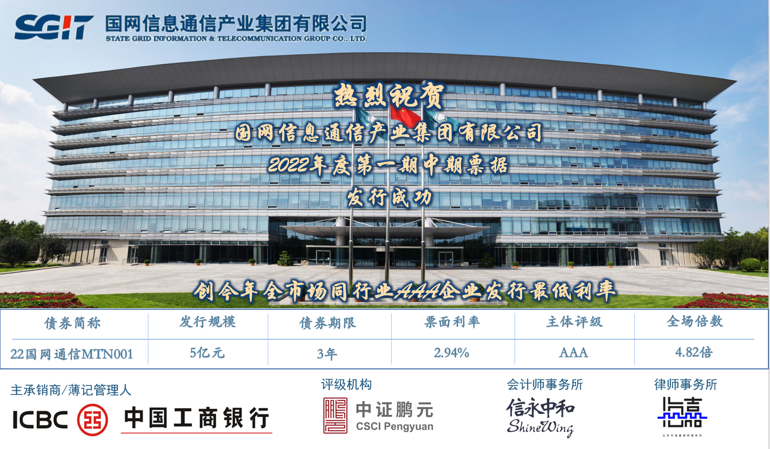 2022年5月20日,國(guó)網(wǎng)信息通信產(chǎn)業(yè)集團(tuán)有限公司(以下簡(jiǎn)稱“集團(tuán)”)首次公開(kāi)成功發(fā)行2022年度第一期中期票據(jù)(債券簡(jiǎn)稱“22國(guó)網(wǎng)信通MTN001”),發(fā)行規(guī)模5億元,期限3年,票面利率2.94%,全場(chǎng)認(rèn)購(gòu)倍數(shù)4.82倍。該利率較3年期同期貸款利率下降約1.3個(gè)百分點(diǎn),為今年全市場(chǎng)同行業(yè)AAA企業(yè)發(fā)行最低利率。