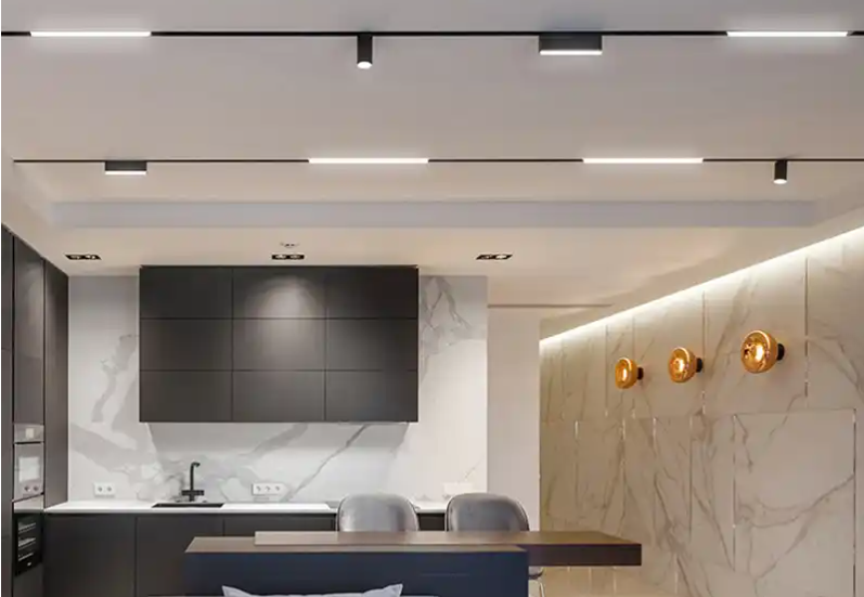 這次裝修時她選擇了更有氛圍感的無主燈設(shè)計,雖然也沒有做吊頂,但是可以通過明裝筒燈、射燈、軌道燈、磁吸燈的組合設(shè)計,打造一個有空間層次、有照明重點、有氛圍感的光環(huán)境,整個空間的高級感立馬就出來。