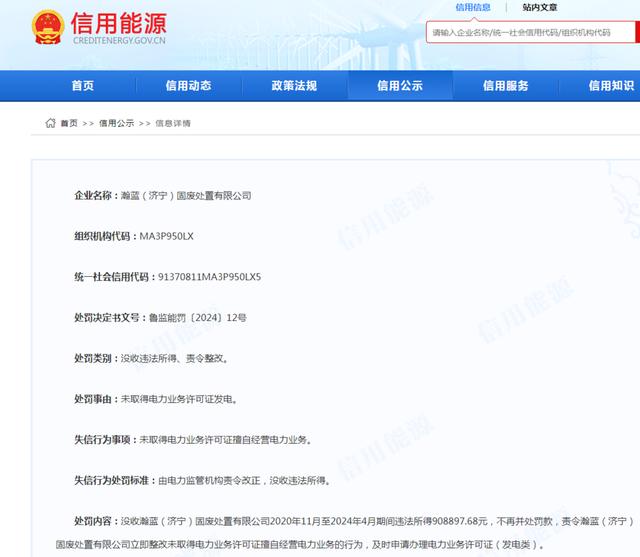 日前,信用能源公布了對(duì)瀚藍(lán)(濟(jì)寧)固廢處置有限公司的行政處罰決定,魯監(jiān)能罰〔2024〕12號(hào)處罰決定書文號(hào)顯示,瀚藍(lán)(濟(jì)寧)固廢處置有限公司未取得電力業(yè)務(wù)許可證發(fā)電。山東能源監(jiān)管辦沒收瀚藍(lán)(濟(jì)寧)固廢處置有限公司2020年11月至2024年4月期間違法所得908897.68元,不再并處罰款,責(zé)令瀚藍(lán)(濟(jì)寧)固廢處置有限公司立即整改未取得電力業(yè)務(wù)許可證擅自經(jīng)營電力業(yè)務(wù)的行為,及時(shí)申請(qǐng)辦理電力業(yè)務(wù)許可證(發(fā)電類)。