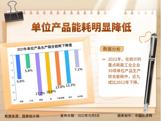 通過推動工藝升級、更新改造用能設(shè)備、加快淘汰落后產(chǎn)能、推廣高效節(jié)能技術(shù),單位產(chǎn)品綜合能耗不斷下降。2021年,在統(tǒng)計的重點耗能工業(yè)企業(yè)39項單位產(chǎn)品生產(chǎn)綜合能耗中,近九成比2012年下降。其中,噸鋼綜合能耗下降9.8%,火力發(fā)電煤耗下降5.8%,燒堿、機(jī)制紙及紙板、平板玻璃、電石、合成氨生產(chǎn)單耗分別下降17.2%、16.8%、13.8%、13.3%、7.1%。