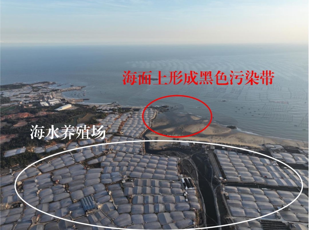 ▲圖4 2023年11月26日,督察組現(xiàn)場督察使用無人機拍攝,漳浦縣將軍灣沿岸密集分布提水式海水養(yǎng)殖場,大量養(yǎng)殖尾水通過溪流直排入海,在海面上形成黑色污染帶