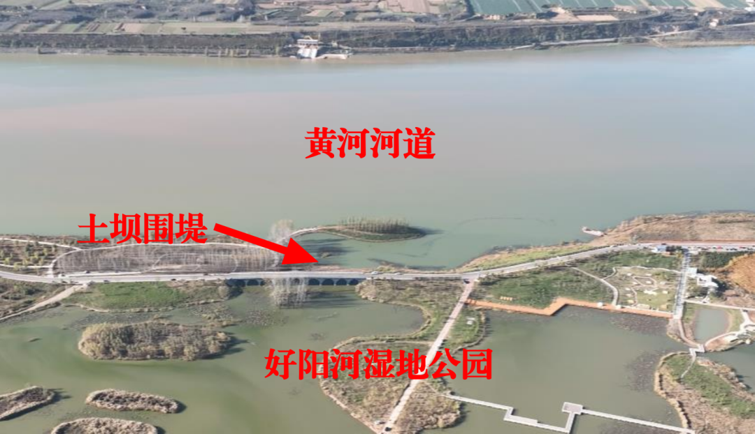 二是違規(guī)阻斷黃河干支流正常連通影響行洪安全。根據(jù)《河南省黃河河道管理辦法》劃定范圍,好陽河濕地公園所在的入黃河口區(qū)域是黃河的河道管理范圍,三門峽城鄉(xiāng)示范區(qū)未按規(guī)定將好陽河濕地公園建設方案報黃河河道主管部門審核,而且違反河道管理條例關于“在河道管理范圍內,禁止修建圍堤、阻水渠道、阻水道路”等管理規(guī)定,在好陽河入黃河口處違規(guī)修筑土壩圍堤,防止黃河高水位時淹沒好陽河濕地公園,從而阻斷黃河干流與好陽河正常連通,影響河道行洪安全。