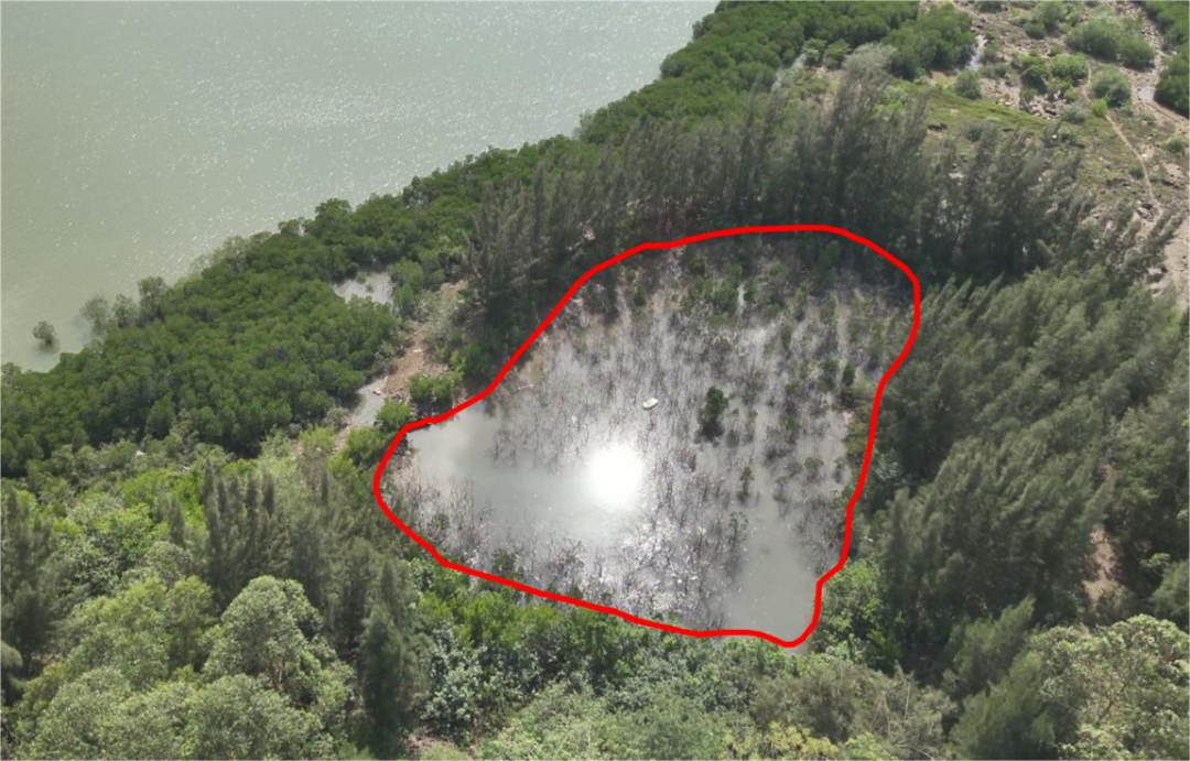 ▲圖2 2023年11月23日,督察組現(xiàn)場督察使用無人機拍攝,臨高縣彩橋紅樹林自然保護區(qū)內900余株紅樹林枯死