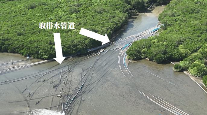 ▲圖5 2023年11月22日,督察組現(xiàn)場督察使用無人機拍攝,養(yǎng)殖塘取排水設施穿越清瀾紅樹林省級自然保護區(qū)核心區(qū)