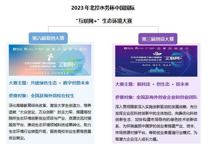 目前,北控水務(wù)杯第六屆中國國際“互聯(lián)網(wǎng)+”生態(tài)環(huán)境創(chuàng)新創(chuàng)業(yè)大賽(以下簡稱“雙創(chuàng)大賽”)和第三屆中國國際“互聯(lián)網(wǎng)+”生態(tài)環(huán)境科技創(chuàng)投大賽(以下簡稱“創(chuàng)投大賽”)兩場賽事報名通道已在北控水務(wù)集團(tuán)官網(wǎng)(http://www.bewg.net/)正式開啟,報名截止日期為2023年10月10日,并擬定于12月初在南京大學(xué)舉辦現(xiàn)場總決賽。