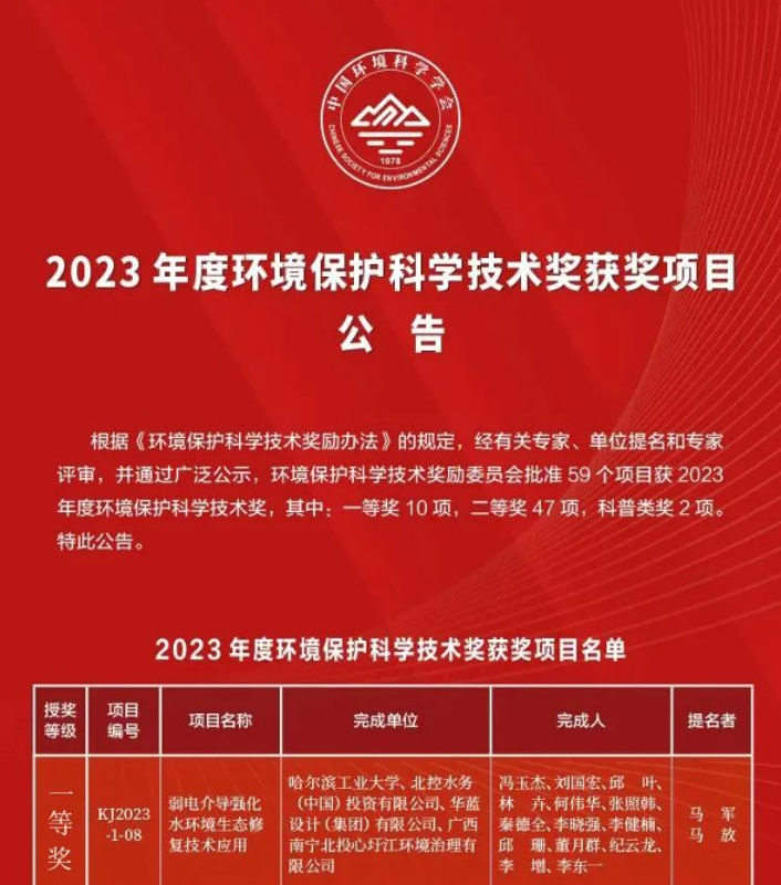 2023年12月25日,中國(guó)環(huán)境科學(xué)學(xué)會(huì)發(fā)布《2023年度環(huán)境保護(hù)科學(xué)技術(shù)獎(jiǎng)獲獎(jiǎng)項(xiàng)目公告》,北控水務(wù)參與申報(bào)的“弱電介導(dǎo)強(qiáng)化水環(huán)境生態(tài)修復(fù)技術(shù)應(yīng)用”榮獲一等獎(jiǎng)。本次共批準(zhǔn)59個(gè)項(xiàng)目,其中一等獎(jiǎng)10項(xiàng),二等獎(jiǎng)47項(xiàng),科普類獎(jiǎng)2項(xiàng)。