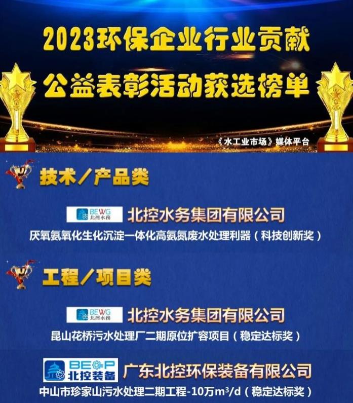 1月2日,2023環(huán)保企業(yè)行業(yè)貢獻(xiàn)公益表彰活動(dòng)榜單正式揭曉,北控水務(wù)集團(tuán)“厭氧氨氧化生化沉淀一體化高氨氮廢水處理利器”榮獲科技創(chuàng)新獎(jiǎng),“昆山花橋污水處理廠二期原位擴(kuò)容項(xiàng)目”及“中山市珍家山污水處理二期工程-10萬(wàn)m³/d”榮獲穩(wěn)定達(dá)標(biāo)獎(jiǎng)。