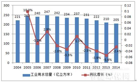 近年來我國工業(yè)用水一直處于一個較高的水平,據(jù)統(tǒng)計,2006 年至2014 年我國工業(yè)用水量維持在1400 億立方米/年左右,大量的工業(yè)用水加劇了我國水資源緊缺的困境。與此同時,我國每年排放大量的工業(yè)廢水,對環(huán)境造成重大污染。2014 年我國工業(yè)廢水排放量為205.3 億噸,同比減少2.1%。盡管我國工業(yè)廢水排放量逐年減少,但現(xiàn)階段工業(yè)污水排放量依然十分巨大。