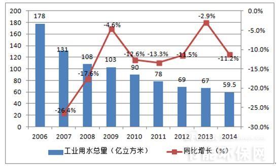 在我國工業(yè)企業(yè)用水效率不高,導致我國工業(yè)企業(yè)用水量大,工業(yè)廢水排放多,迚一步加劇了我國水資源短缺的困境。根據(jù)水利部的統(tǒng)計,盡管我國萬元工業(yè)增加值用水量呈現(xiàn)出不斷下降的趨勢,2014 年萬元工業(yè)增加值用水量59.5 立方米(當年價),按可比價計算比2010 年下降32%。但與發(fā)達國家相比我國萬元工業(yè)增加值用水量較大,工業(yè)企業(yè)用水效率有待迚一步提高。在水資源緊缺的背景下,提高工業(yè)用水效率,降低工業(yè)對水資源過量消耗成為生態(tài)文明建設(shè)的必然要求,近期出臺的水十條明確提出,提高用水效率,到2020 年全國萬元工業(yè)增加值用水量比2013 年下降30%以上;抓好工業(yè)節(jié)水制定國家鼓勵和淘汰的用水技術(shù)、工藝、產(chǎn)品和設(shè)備目彔,完善高耗水行業(yè)取用水定額標準。我們認為中水回用和廢水零排放成為工業(yè)廢水處理的下一個主攻方向,相關(guān)企業(yè)發(fā)展前景廣闊。