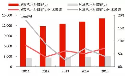 4)城市污水處理能力在2015年達(dá)到1.40億立方米/日,同比增長7.19%;縣城達(dá)到2999萬立方米/日,同比增長了4.06%,城市和縣城的污水處理率分別達(dá)到91.9%和85.2%,較2010年分別提升了9.6和25.1個百分點(diǎn)。