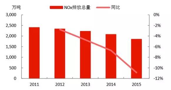 NOx的排放量為1852萬噸,“十二五”剛開始治理,當(dāng)前的下降速度還處于上升趨勢,收關(guān)年2015年下降速度高達(dá)10.89%。