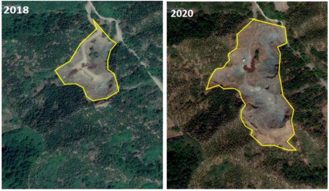 圖4 衛(wèi)星影像圖比對顯示,與2018年相比,2020年百砬溝廢棄礦山山體破壞面積增大