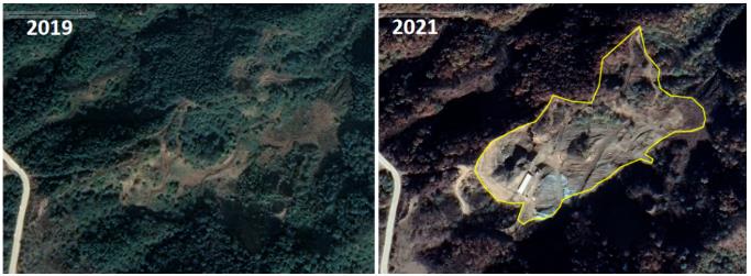 圖2 衛(wèi)星影像圖比對顯示,2019年以來興隆縣掛蘭峪鎮(zhèn)六撥子村一采礦點非法侵占六里坪獼猴省級自然保護區(qū)面積明顯增大
