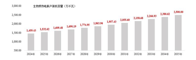 根據(jù)國家發(fā)展改革委、國家能源局發(fā)布的《關于促進生物質能供熱發(fā)展的指導意見》(發(fā)改能源[2017]2123號),到2035年,生物質熱電聯(lián)產(chǎn)裝機容量超過2500萬千瓦,生物質能供熱在具備資源條件的地區(qū)實現(xiàn)普及應用。根據(jù)該指導意見確定的目標,未來生物質熱電聯(lián)產(chǎn)裝機容量預計發(fā)展情況如下: