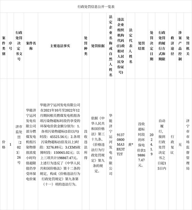 山東濟寧市市場監(jiān)督管理局近日對華能濟寧運河發(fā)電有限公司部分燃煤發(fā)電機組污染物排放濃度小時均值超限值仍享受環(huán)保電價依法作出沒收超標時段的環(huán)保電價款198867.47元的行政處罰,信息如下表: