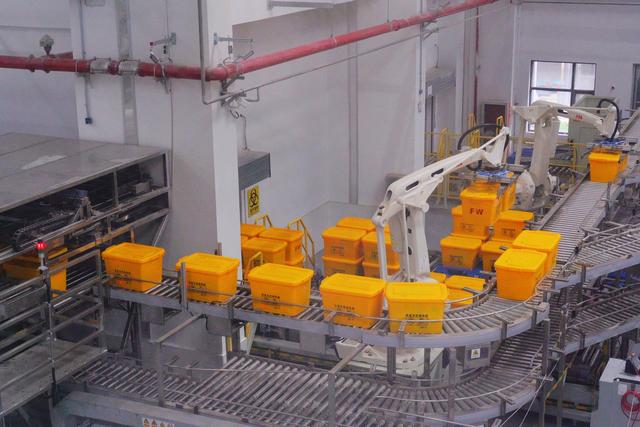 當一輛裝載著醫(yī)療廢物的運輸車進入廠區(qū)后,車廂門一打開,負責卸貨的機械臂便迅速啟動,通過自身配備的攝像頭對周轉(zhuǎn)箱進行拍照識別并完成自動抓取,裝有醫(yī)療廢物的黃色周轉(zhuǎn)箱隨即被放置于輸送線上。為了保證各個環(huán)節(jié)的無縫對接,園區(qū)特別定制了24000個固定尺寸的周轉(zhuǎn)箱,確保從收集、運輸?shù)教幚淼娜^程順利進行。
