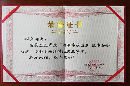6月18日,該公司新入司大學生趙志強參加國網張掖供電公司安全生產月演講比賽,公司《從零開始 向零奮斗》榮獲演講比賽三等獎。