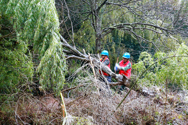 中國(guó)電力網(wǎng)訊 “123…加油!123…加油!大家注意安全,控制好繩索方向,千萬不要讓樹壓在線上……”12月15日,在10千伏坪溪Ⅱ線坪嚴(yán)支線湖竹坪次支,國(guó)網(wǎng)樂安縣供電公司共產(chǎn)黨員服務(wù)隊(duì)隊(duì)員正在清理覆冰線路通道外的樹木,保障低溫冰凍天氣電網(wǎng)安全穩(wěn)定運(yùn)行。